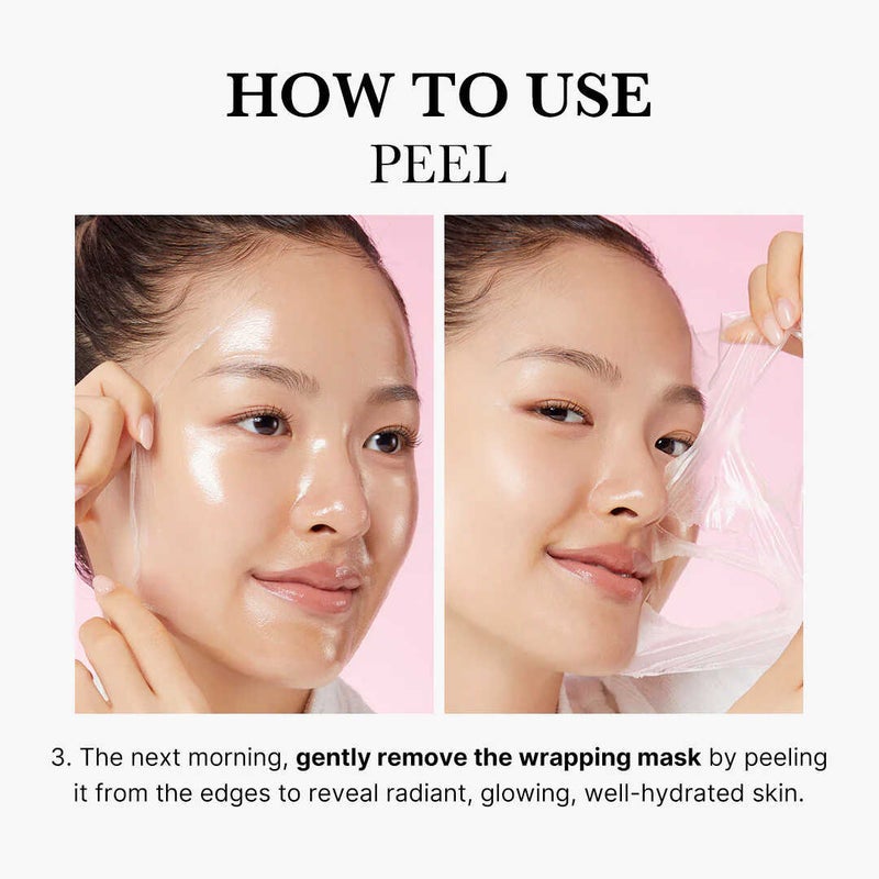 4. The next morning, gently remove the wrapping mask by peeling it from the edges or thoroughly rinse it off with lukewarm water to reveal refreshed skin.